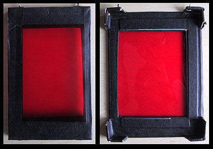 After exposure, place your plate under the Amberlith printer's screen. To make a mask, use lightly colored cardboard or matt board a few inches larger than the size of your plate. Cut a window slightly smaller than the plate and tape a piece of Amberlith over it. Then, tape strips of board on the opposite side of the mask, surrounding the plate, insuring that it can't move during development or touch the screen. I usually tape the plate to the mask from the back. Certainly there are more elegant ways of making a mask, but none easer or more convenient.